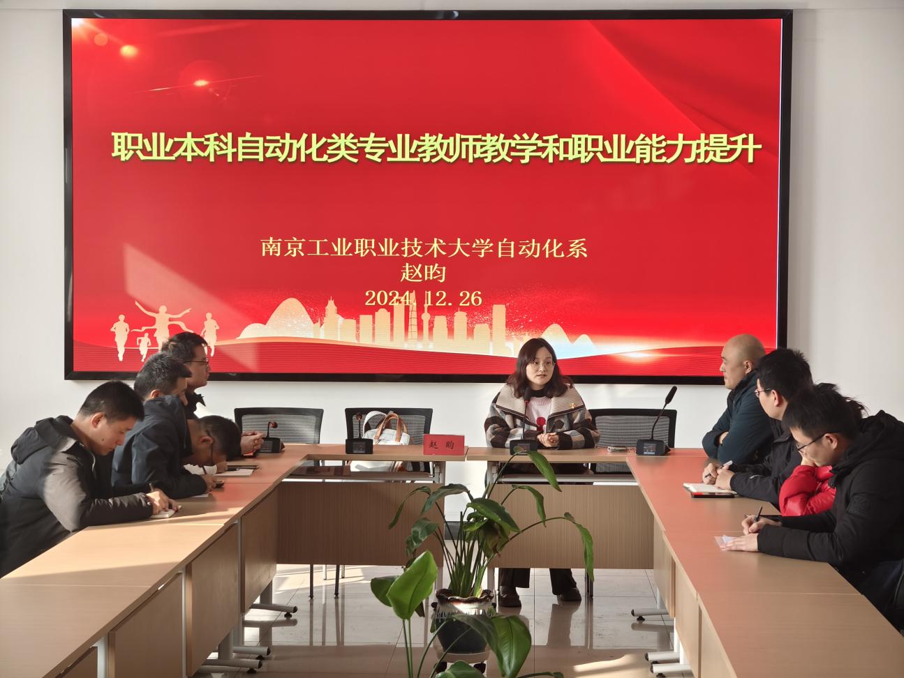 为提升公司青年教师教学和职业能力,更好适应未来职业本科层面教学。2024年12月27日,我院邀请南京工业职业技术大学自动化专业赵昀主任为公司青年教师开展题为《自动化类专业教师教学和职业能力提升》的报告会。赵昀主任就自动化技术专业的课程体系优化、教学方法创新、教学资源建设、深化产教融合、教学评价改进等方面进行了深入浅出的报告分享,会后公司青年教师与赵昀主任进行了充分的交流研讨。通过此次活动,公司青年教师受益匪浅,不仅拓宽了视野,对个人发展规划更加清晰明了,而且增进了对职业本科专业建设的了解。
